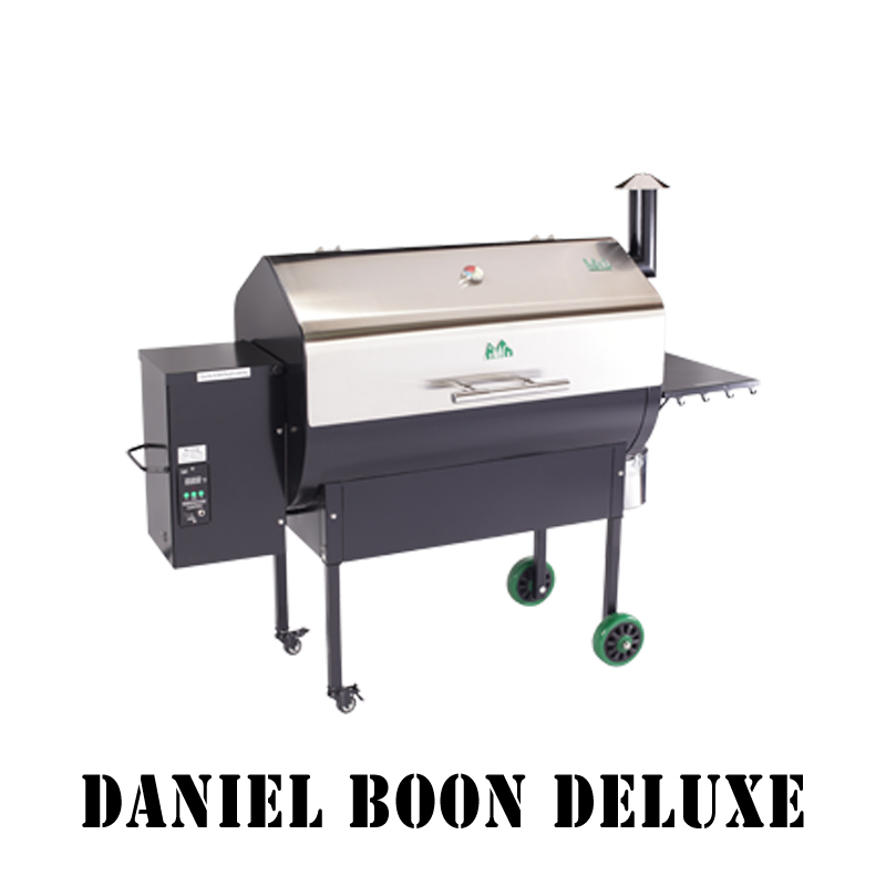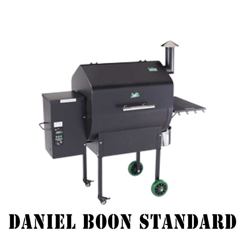 The Daniel Boone Model comes with a digital control, a meat probe, a peaked lid for stand-up chicken/ large fowl/ rib racks, a convenience tray with utensil hooks, hard rubber tires. and a venturi-style firebox for cyclone combustion. It also has Sense-Mate™ - a circuit-board-mounted thermal sensor which measures ambient temperature and kicks the grill into “turbo” mode in cold weather so that you do not have to wait long for the grill to heat up in winter.